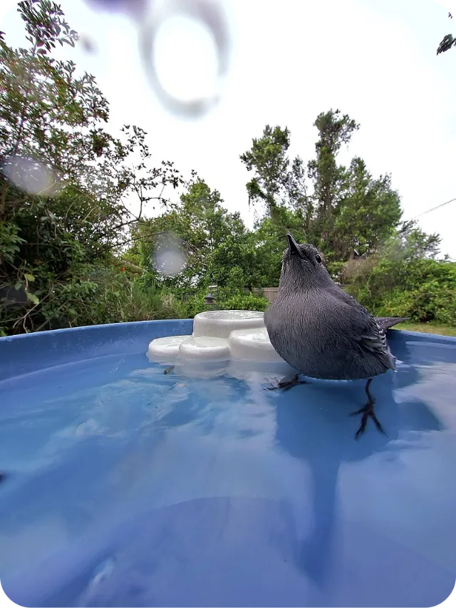During the summer, when food is abundant but water can be scarce, birds are often on the lookout for a refreshing drink or a quick dip to cool off. Adding a bird bath near your Birdbuddy setup is a great way to catch their attention and bring them closer to your feeder.